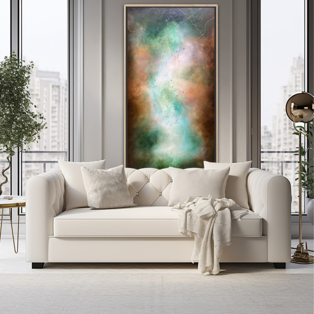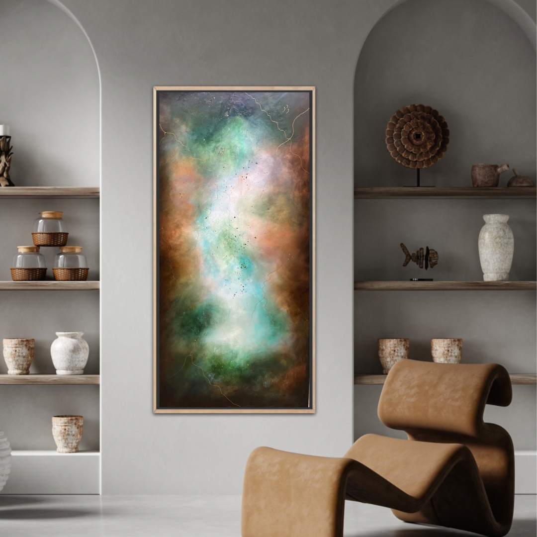 Når jeg maler under en slik energi, opplever jeg at tid og rom opphører. Det er som å tre inn i en flyt hvor jeg ikke lenger styrer penselen, men lar den bli et redskap for noe større. Fargene fant hverandre, lag på lag, som en bevegelse oppover, en lysende strøm som presset seg gjennom mørket, som om noe gammelt måtte gi slipp for å gi plass til noe nytt.